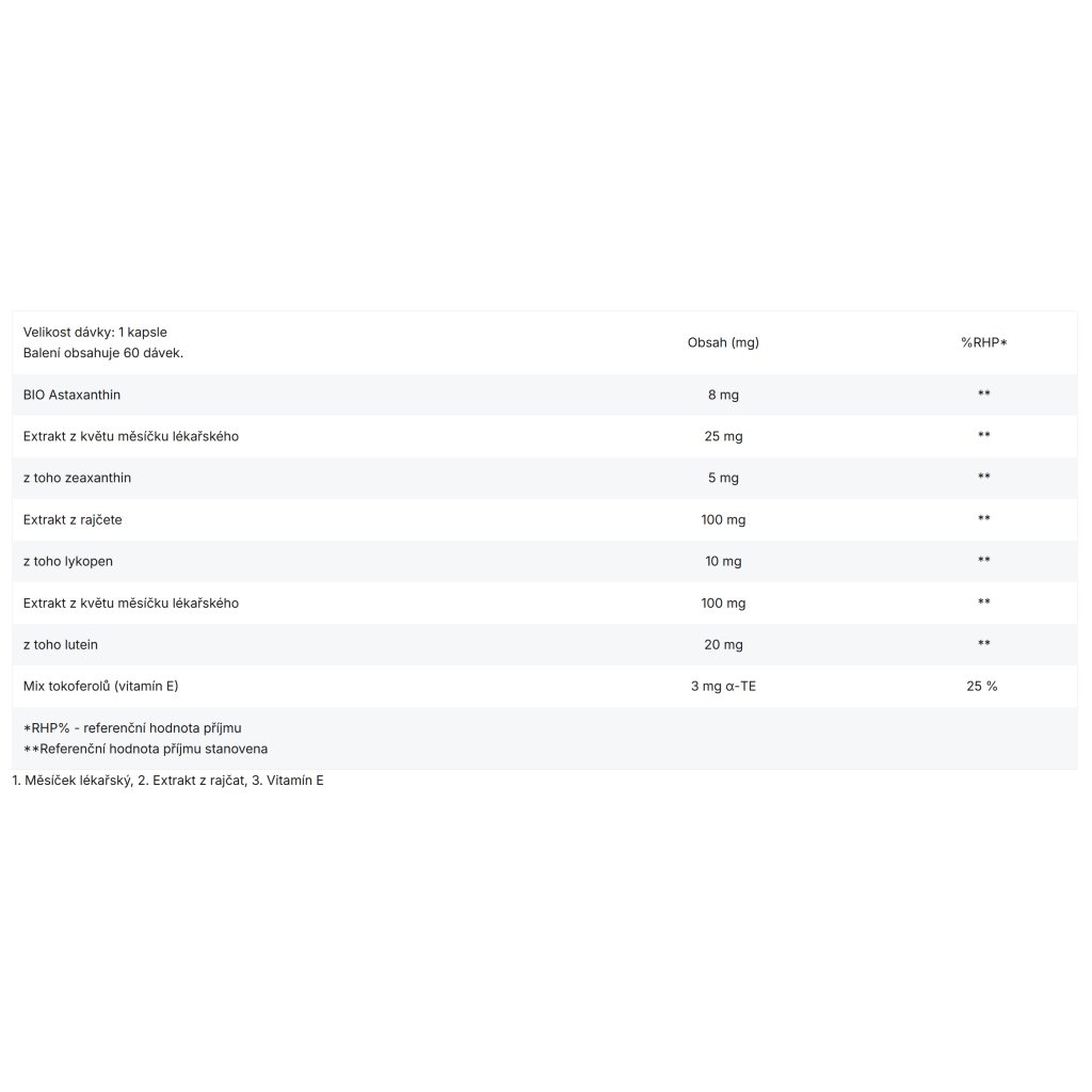 - Lutein (20 mg), zeaxanthin (5 mg) a lykopen (10 mg) – synergická trojice karotenoidů z měsíčku lékařského a rajčat pro zdraví očí, pokožky i celkovou antioxidační ochranu.