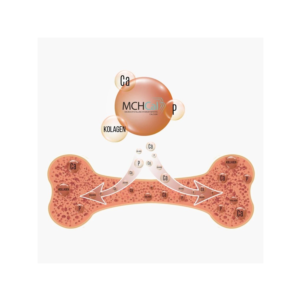 Mikrokrystalický hydroxyapatit (MCHCal®) je patentovaná kombinace látek jako vápník, fosfor a kolagenu typu I a jsou téměř v identickému poměru jako v lidské kostní tkáni, a tak je vyhledávanou surovinou v doplňcích stravy zaměřených na péči o kosti. V kombinaci s vitamíny D3 a K2, hořčíkem, zinkem, liposomálním vitamínem C a dalšími minerály představuje funkční základ pro všechny, kteří chtějí svému pohybovému aparátu věnovat skutečně komplexní výživu.