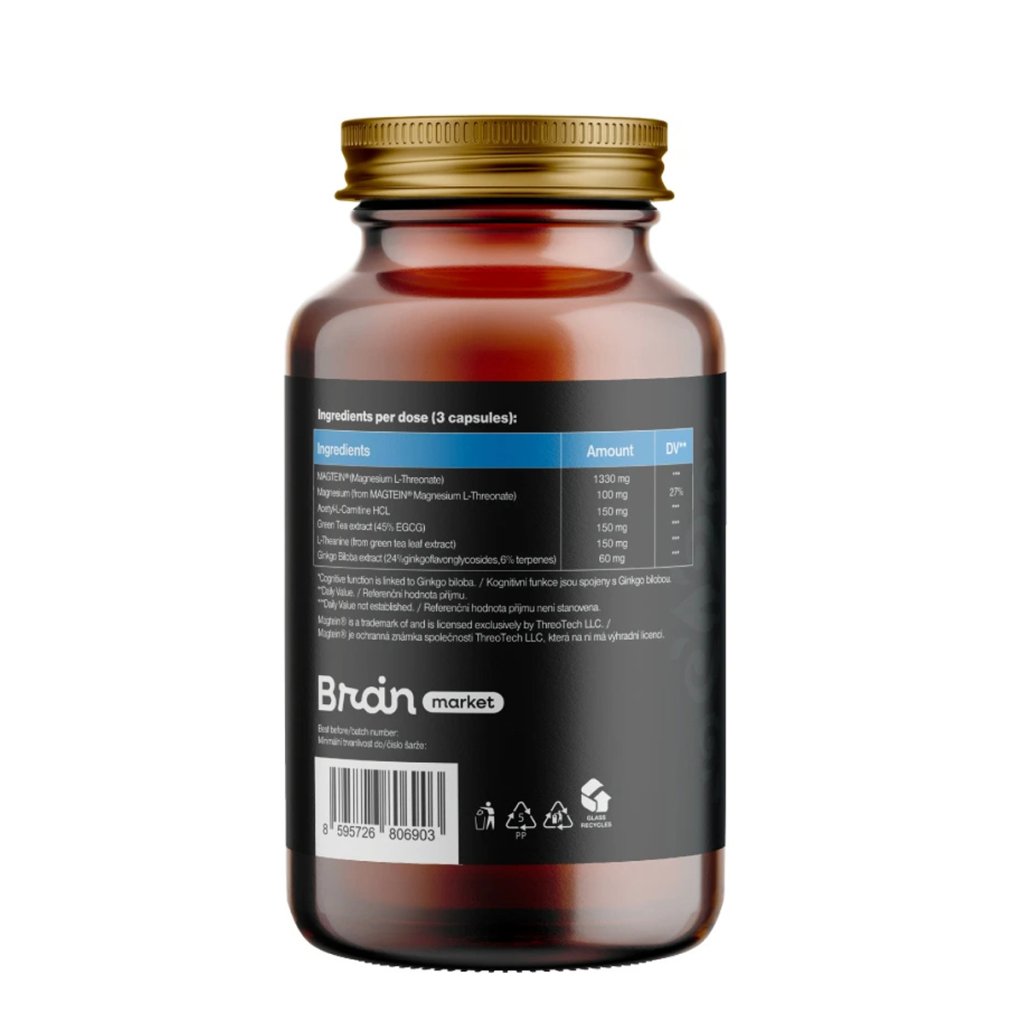 MAGTEIN® (hořčík-l-threonát), hořčík (z MAGTEIN® hořčík l-threonát), Acetyl-L-Karnitin HCL , extrakt ze zeleného čaje (45% EGCG), L-Theanin (z extraktu zeleného čaje), Ginkgo biloba extrakt (24% ginkgoflavonoglykosidů, 6% terpenů). Rostlinná kapsle na bázi HPMC. Bez obsahu balastních látek.