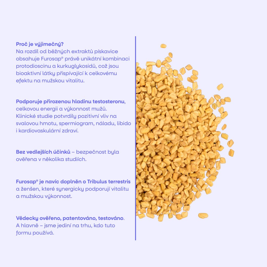 - FuroSap® Plus – extrakt pískavice řeckého sena (18 % protodioscinů) doplněný o Curculigo Orchioides (3 % curculigosidů).