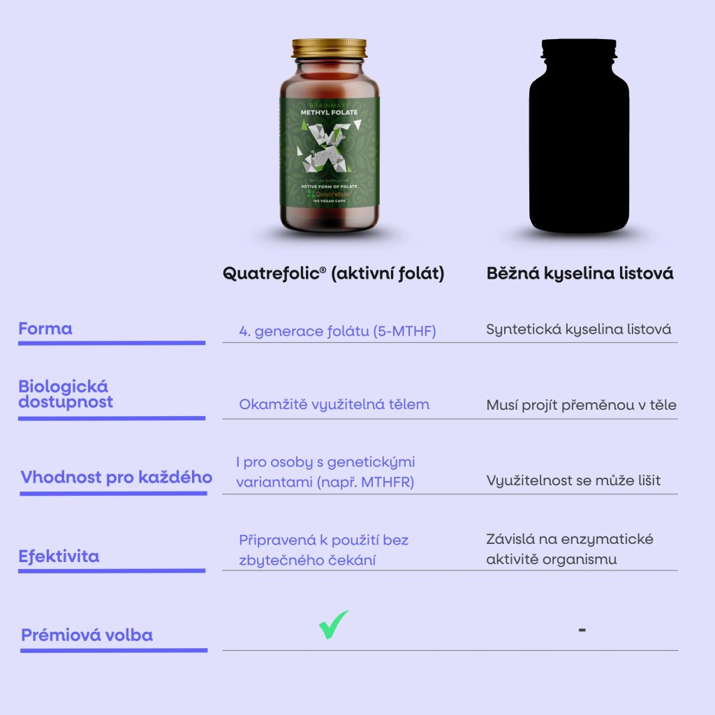 Zapomeňte na běžnou syntetickou kyselinu listovou. Quatrefolic® je nejpokročilejší forma folátu (5-MTHF), kterou tělo dokáže okamžitě využít bez nutnosti složité přeměny.