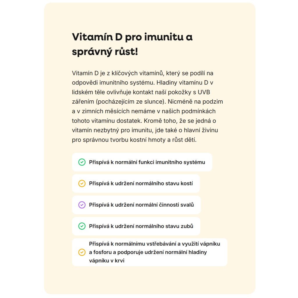 Vitamín D patří mezi nejdůležitější vitamíny pro děti i dospělé. Ovlivňuje nejen imunitní odpověď, ale je také klíčový pro stavbu kostí, zubů a správný růst. Naše tělo si jej sice dokáže vytvářet při kontaktu pokožky se slunečním UVB zářením, ale v našich podmínkách je jeho hladina v zimních a podzimních měsících často nedostatečná.