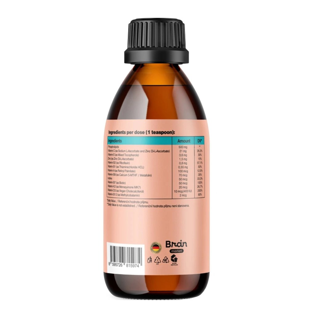 Voda, glycerol (přírodní stabilizátor), mango aroma, fosfolipidy (slunečnicový lecithin) (500 mg, RHP **), Vitamin C (jako Sodium L-Ascorbate a Zinc Di-L-Ascorbate) (21 mg, RHP 26,2 %), Vitamin E (jako Mixed Tocopherols) (3,6 mg, RHP 30 %), Zinek (jako Zinc Di-L-Ascorbate) (1,5 mg, RHP 15 %), kyselina citronová monohydrát, Vitamin B2 (jako Riboflavin) (0,8 mg, RHP 57,1 %), Vitamin B1 (jako Thiaminechloride HCL) (0,55 mg, RHP 50 %), Vitamin A (jako Retinyl Palmitate) (100 mcg, RHP 12,5 %), Vitamin B9 (jako Calcium 5-MTHF / Metafolin) (70 µg, RHP 35 %), Jód (jako Potassium Iodide) (50 µg, RHP 33,3 %), Vitamin B7 (jako Biotin) (50 µg, RHP 100 %), Vitamin K2 (jako Menaquinone MK7) (20 µg, RHP 26,7 %), Vitamin D3 (jako Vegan Cholecalciferol) (10 µg, RHP 200 %), extrakt z rozmarýnu (kyselina karnozová +), Vitamin B12 (jako Methylcobalamin) (2 µg, RHP 80 %).