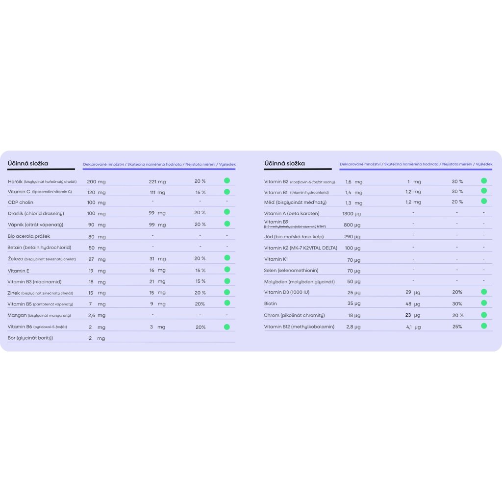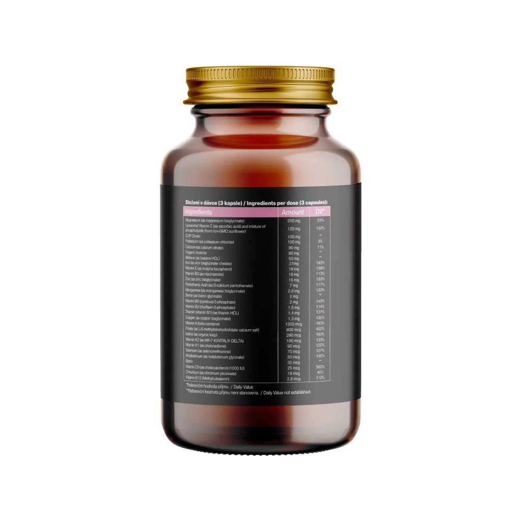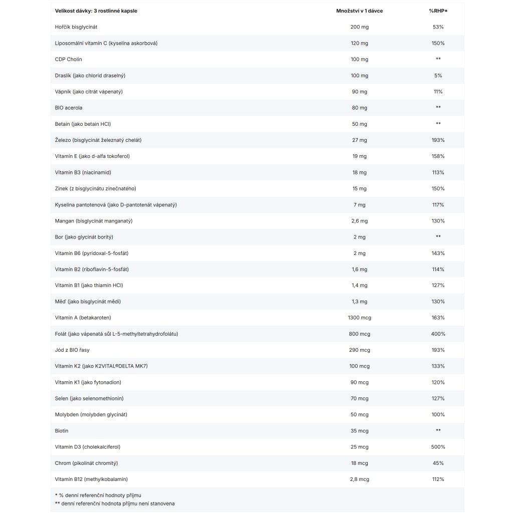 Hořčík bisglycinát, liposomální vitamín C (kyselina askorbová), CDP Cholin, draslík (jako chlorid draselný), vápník (jako citrát vápenatý), BIO acerola, betain (jako betain HCl), železo (bisglycinát železnatý chelát), vitamín E (jako d-alfa tokoferol), vitamin B3 (niacinamid),vitamin B3 (niacinamid), zinek (z bisglycinátu zinečnatého), kyselina pantotenová (jako D-pantotenát vápenatý), mangan (bisglycinát manganatý), bor (jako glycinát boritý), Vitamín B6 (pyridoxal-5-fosfát), Vitamín B2 (riboflavin-5-fosfát), vitamin B1 (jako thiamin HCl), měď (jako bisglycinát mědi), vitamin A (betakaroten), folát (jako vápenatá sůl L-5-methyltetrahydrofolátu), jód z BIO řasy, vitamin K2 (jako K2VITAL®DELTA MK7), vitamin K1 (jako fytonadion), selen (jako selenomethionin), molybden (molybden glycinát), biotin, vitamin D3 (cholekalciferol), chrom (pikolinát chromitý), vitamín B12 (methylkobalamin)