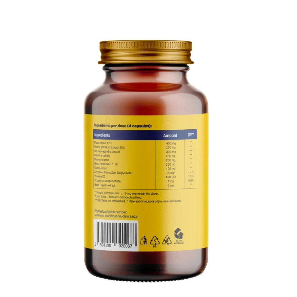 Punica Granatum Extract (30% punicalagins), Withania Somnifera Root Extract, Urtica Dioica Extract, Lepidium Meyenii Extract (1:10), Oyster Extract, Zinc Bisglycinate, Cholecalciferol (Vitamin D3), Brassica Oleracea Italica Extract, L-Carnitine L-Tartrate, Piper Nigrum Extract (95% Piperine)