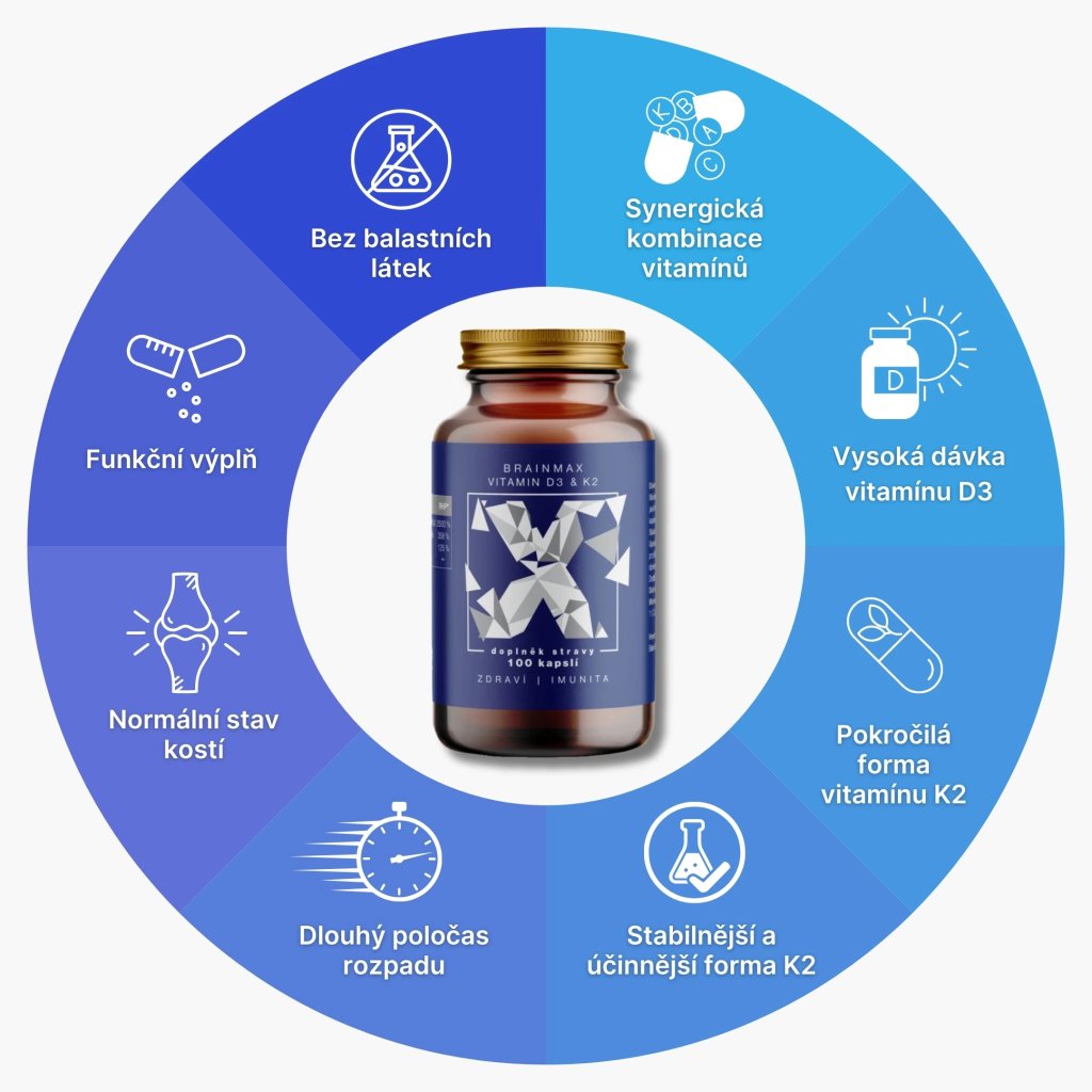 BrainMax Vitamin D3 & K2 kombinuje dvě klíčové mikroživiny – vitamín D3 a vitamín K2 (MK-7) – spolu s BIO kurkumou pro každodenní výživu a ochranu kostního systému. Vitamín D3 podporuje normální vstřebávání vápníku a fosforu, čímž přispívá k udržení pevných a zdravých kostí.