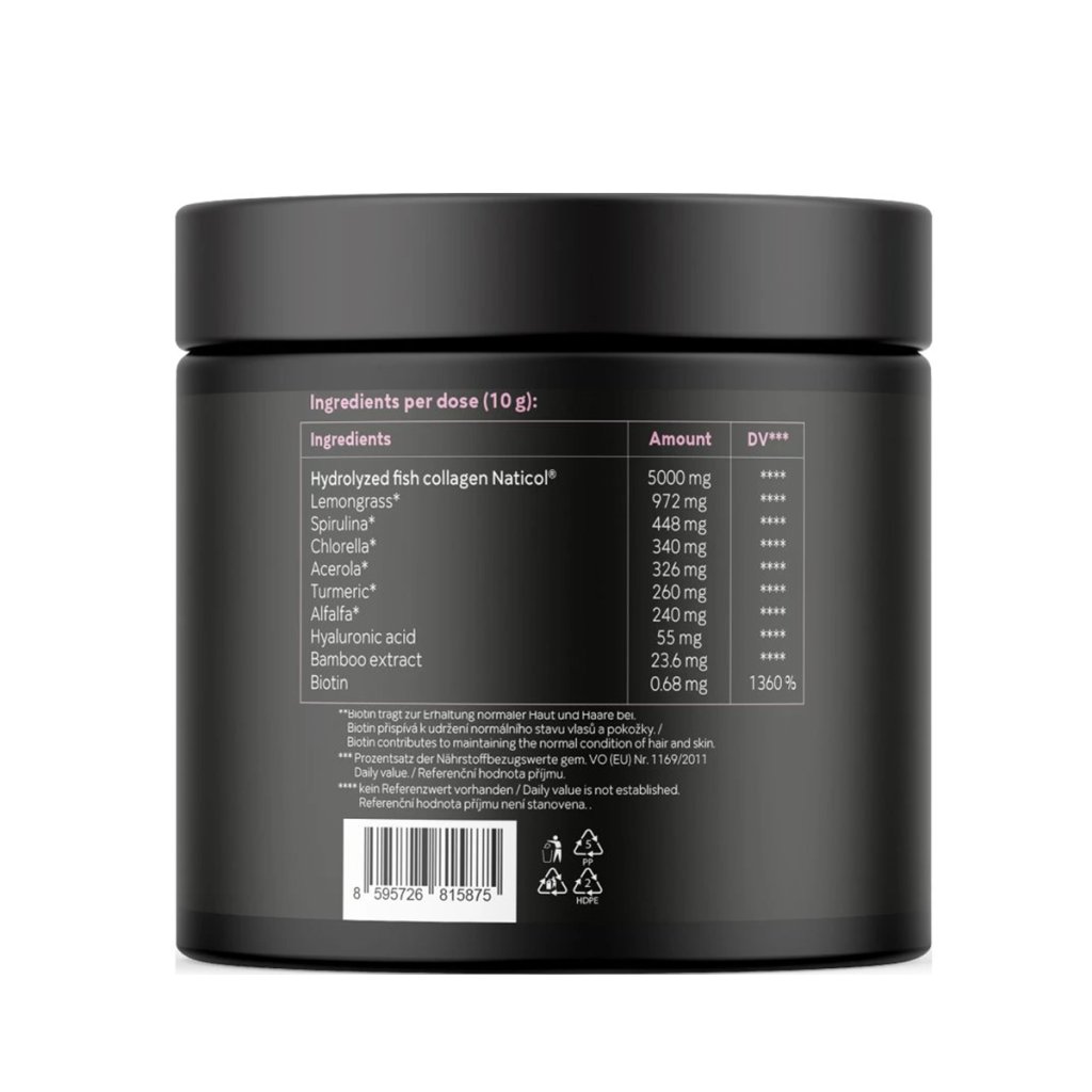 Hydrolyzovaný rybí kolagen Naticol® (5000 mg, RHP****), inulin*, citronová tráva* (972 mg, RHP****), spirulina* (448 mg, RHP***), chlorella* (340 mg, RHP****), acerola* (326 mg, RHP***), přírodní aroma, kyselina citronová, kurkuma* (260 mg, RHP****), alfalfa* (240 mg, RHP***), kyselina hyaluronová (55 mg, RHP 110%), bambusový extrakt (75 % křemíku) (23,6 mg, RHP****), biotin (68 µg, RHP***), sladidlo: steviol-glykosidy. *produkt z ekologického zemědělství.